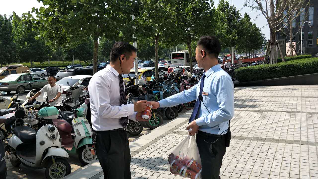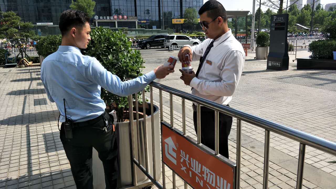 就是在這樣站著不動(dòng),都會(huì)全身冒汗的天氣里,最辛苦的工作莫過(guò)于室外作業(yè),而我們興業(yè)物聯(lián)的外圍秩序崗員工在近日連續(xù)38℃的高溫下,依然堅(jiān)守在崗位上, 他們不是不怕熱,他們只是有更重要的責(zé)任在身上,他們不敢怕熱,如果他們怕熱退縮了,誰(shuí)來(lái)維護(hù)廣場(chǎng)的秩序、誰(shuí)來(lái)檢查墻面標(biāo)識(shí)、誰(shuí)來(lái)給我們業(yè)主提供一個(gè)更舒心的環(huán)境?所以當(dāng)所有人都穿著涼快的衣衫還往空調(diào)房里躲的時(shí)候,我們興業(yè)物聯(lián)的秩序崗員工選擇了穿上長(zhǎng)褲,長(zhǎng)袖襯衣、系上領(lǐng)帶在外守候著···