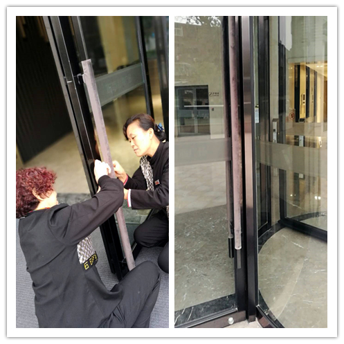 2、大堂門把手保暖套,已在大姐的巧手下安裝到位。