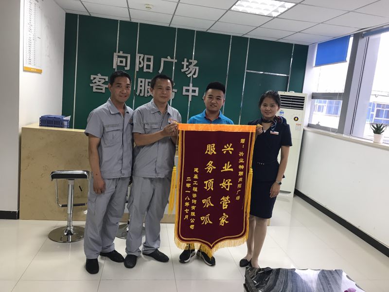 7月30號(hào)建基工程咨詢有限公司為向陽(yáng)廣場(chǎng)客服中心送去錦旗,表示對(duì)興業(yè)物聯(lián)工作的肯定。對(duì)興業(yè)物聯(lián)來(lái)說(shuō)業(yè)戶的認(rèn)可是我們前進(jìn)的最大動(dòng)力,一直以來(lái)興業(yè)物聯(lián)始終堅(jiān)持“真誠(chéng)·專(zhuān)業(yè)·進(jìn)取”為服務(wù)理念,秉承“以客戶為中心,以服務(wù)為己任”的指導(dǎo)思想。每日客服人員的笑臉相迎,秩序人員24小時(shí)不間斷日夜巡邏,為您提供干凈整潔的辦公環(huán)境,只要您需要,興業(yè)物聯(lián)就在您的身邊!