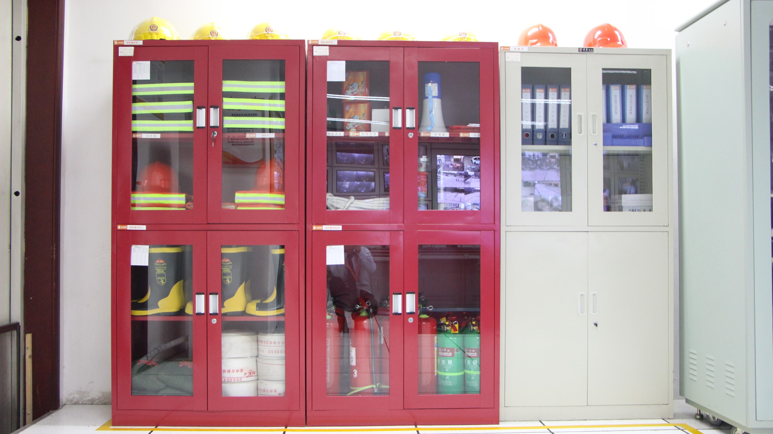 消防、防暴器材存放區(qū)域,物品名稱、規(guī)格標(biāo)識(shí)清楚。